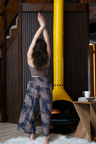 The Wild Bloom Deep Sea palazzo pants draw inspiration from twilight waters and the calm strength found beneath the surface. Rendered in inky blue tones with soft lavender floral linework, this pattern feels both mysterious and feminine—like blossoms drifting through deep ocean currents. It’s a piece that invites introspection, confidence, and graceful presence.