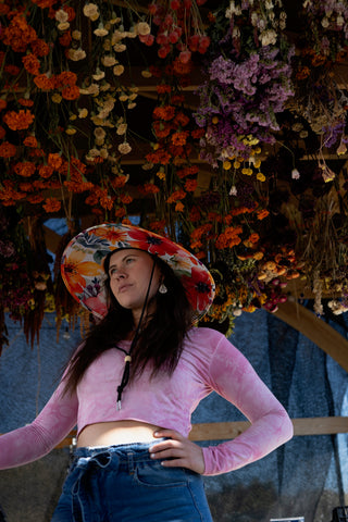 The Josephine Hat blooms with the bold, grounded energy of Earth — a crown of watercolor florals in radiant reds, sunlit yellows, and soft botanical greens. She’s vibrant, feminine, rooted… a reminder that strength can look like a flower opening toward the light.