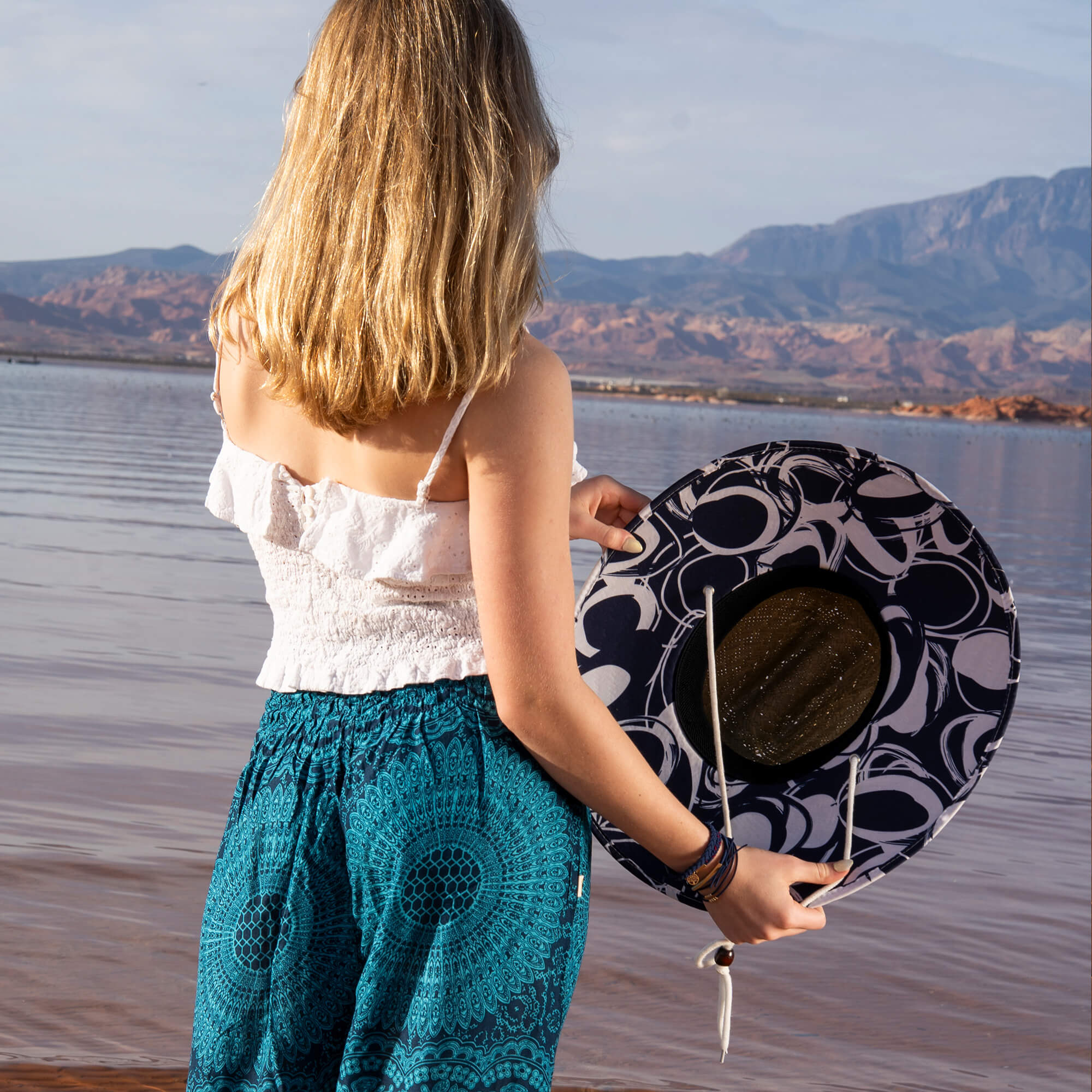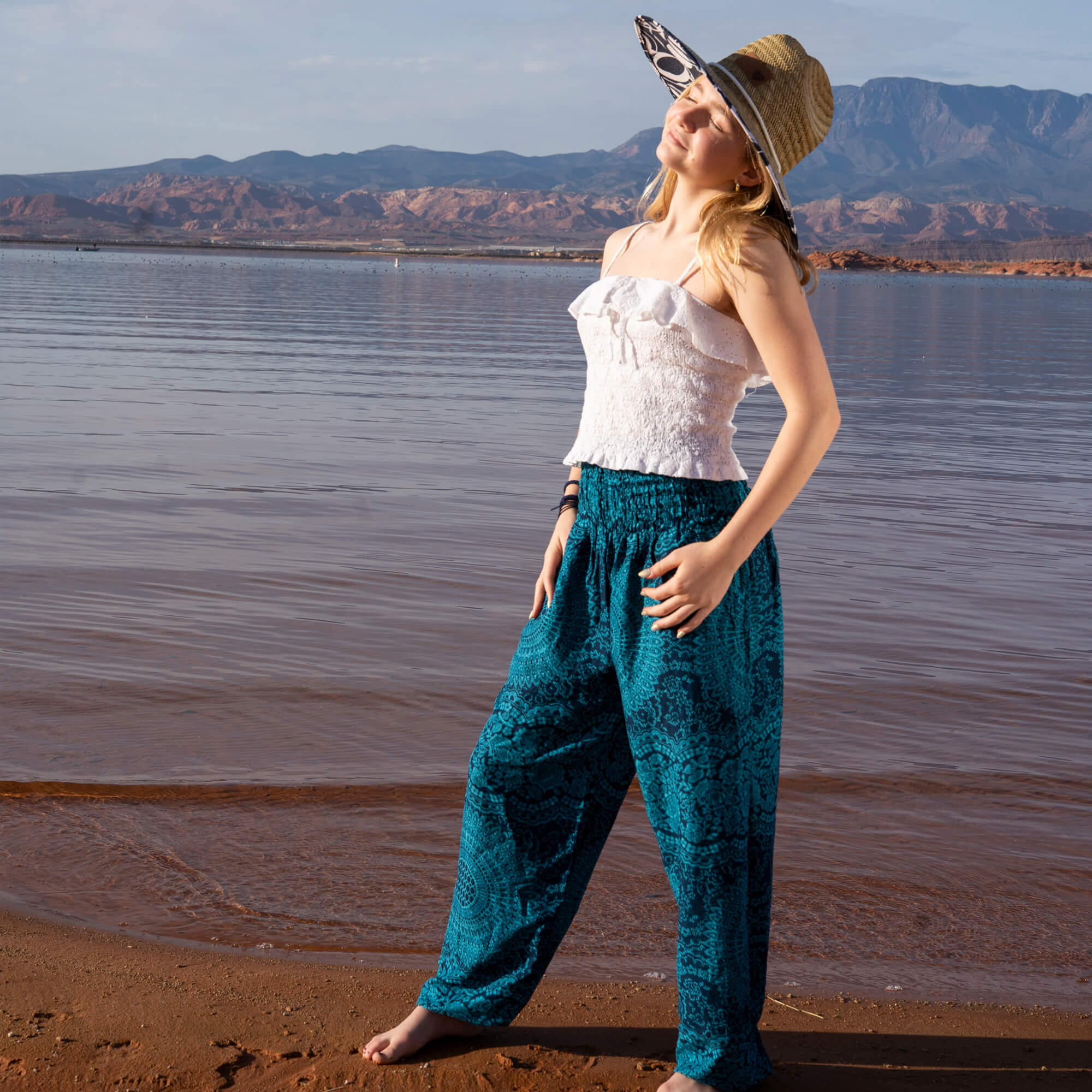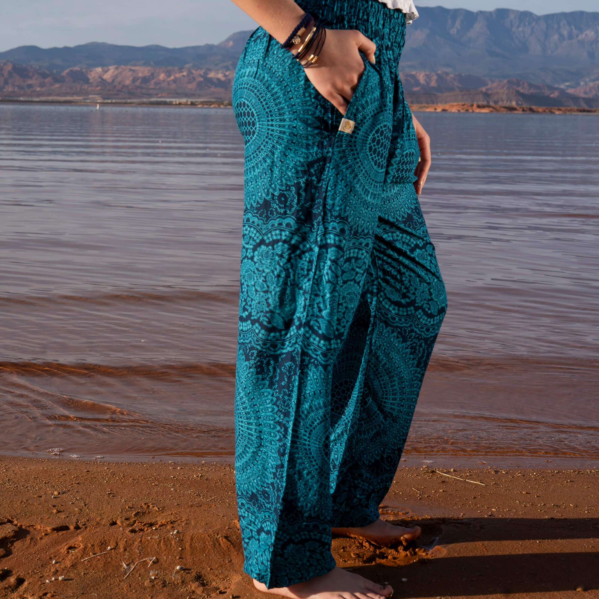 Made from breathable, plant-based rayon viscose with a fluid, wave-like drape, Azure Sky flows easily through motion and stillness — bending, stretching, and softening to your body’s rhythm. The smocked waistband offers a supportive yet freeing fit that expands with your breath, making these pants ideal for yoga, travel, meditation, or slow, mindful days near the water. Their dark-blue mandala pattern pairs beautifully with Water collection hats for a look that feels serene and quietly powerful.