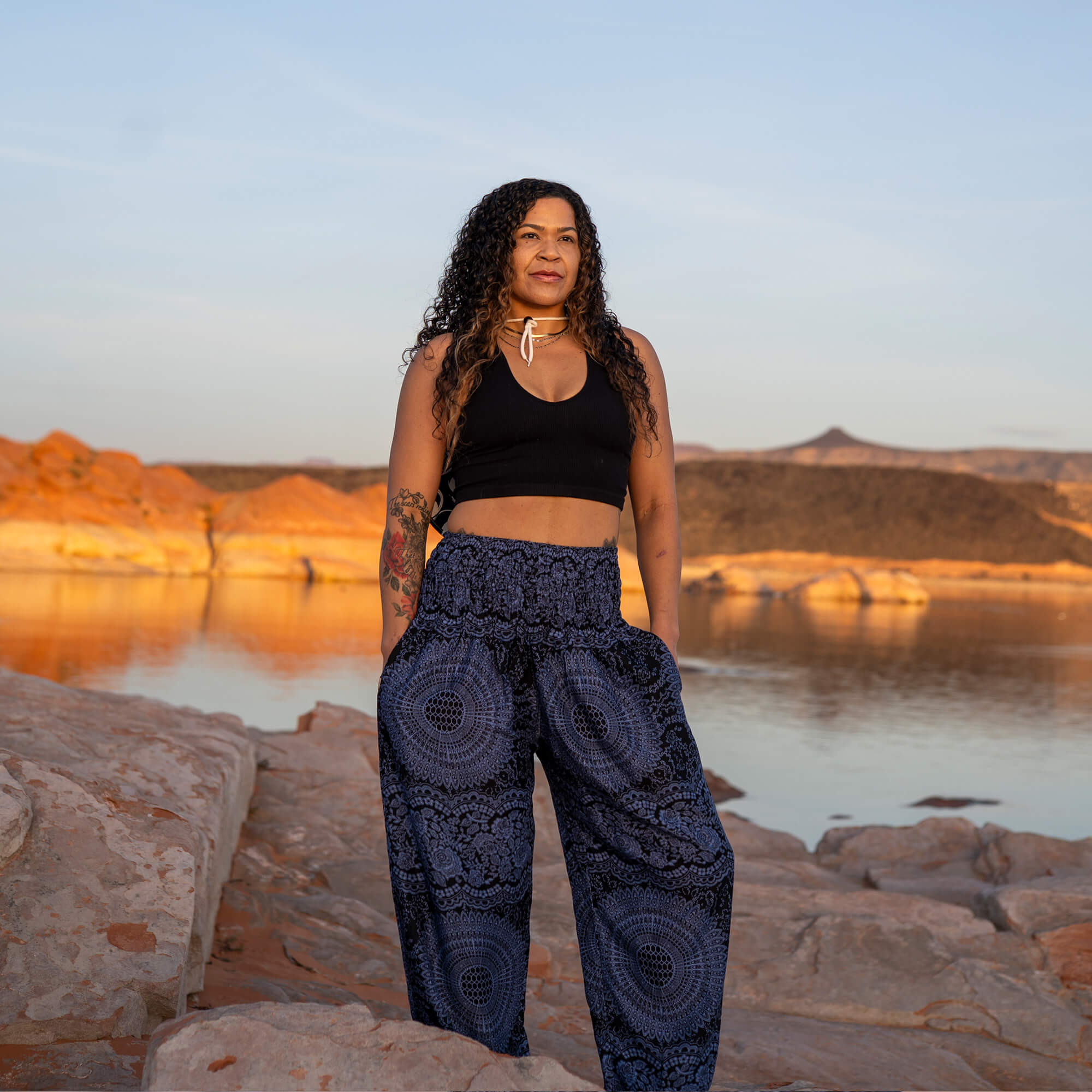 The Elemental Mandala Ocean Wave harem pants feature layered navy and inky black undertones woven into a monotone mandala design that feels calm, powerful, and endlessly grounding. Inspired by the still strength of deep water, they carry Water energy in its most introspective form—steady, intuitive, and unwavering.