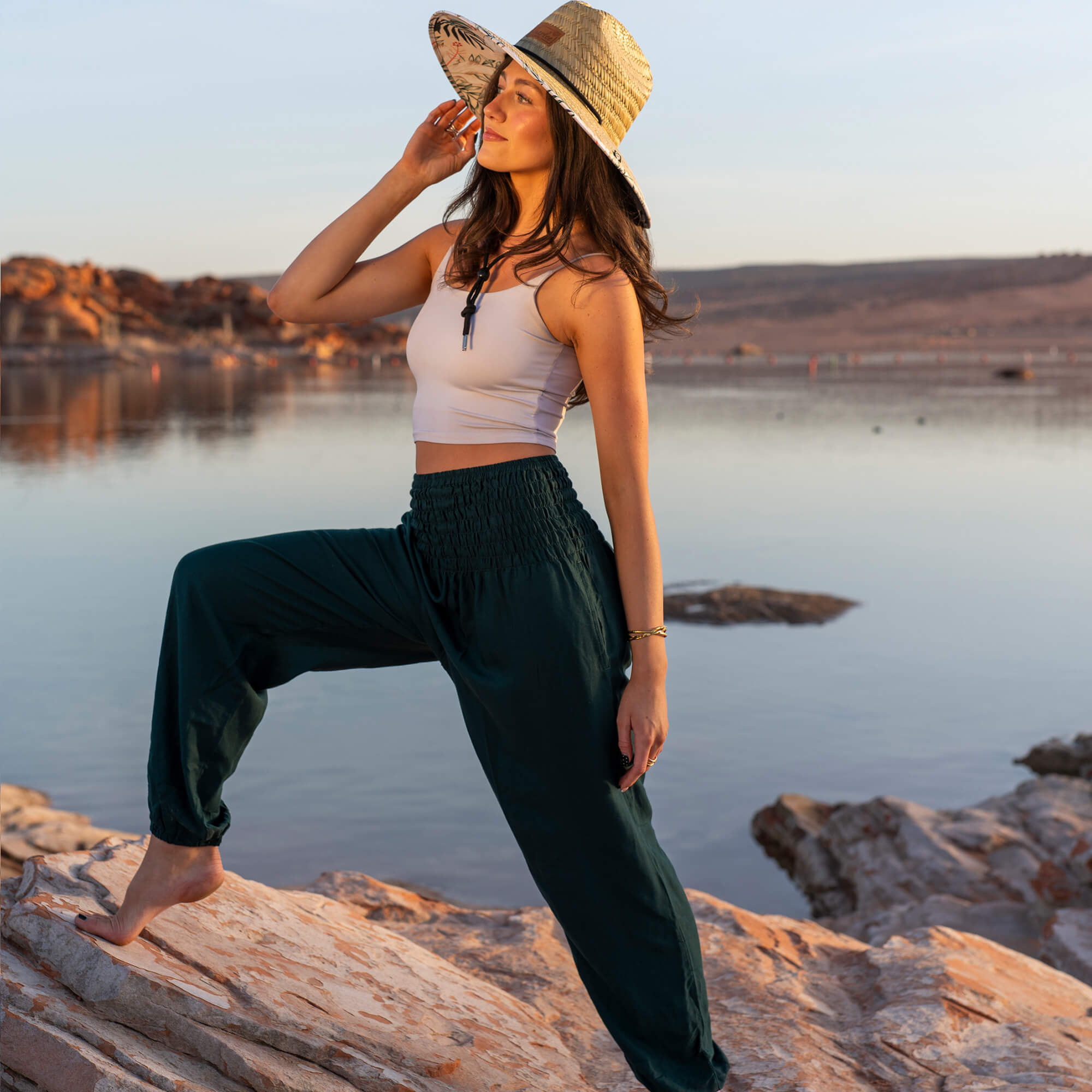 Crafted from breathable, plant-based rayon with a smooth, cloudlike drape, these pants move gently with your body—stretching, flowing, and settling into natural ease. The smocked waistband offers a comfortable, adaptive fit that expands with your breath, creating freedom in every direction. Their airy palette pairs perfectly with your favorite soft neutrals or any hat within the Air Collection for a look that feels lifted and intuitive.