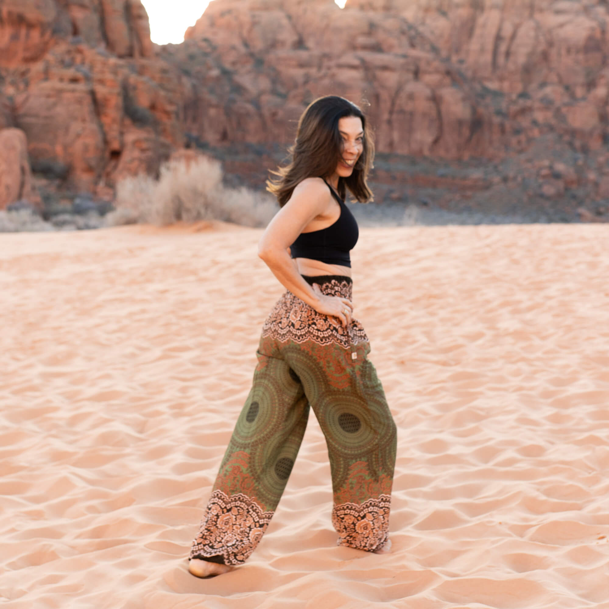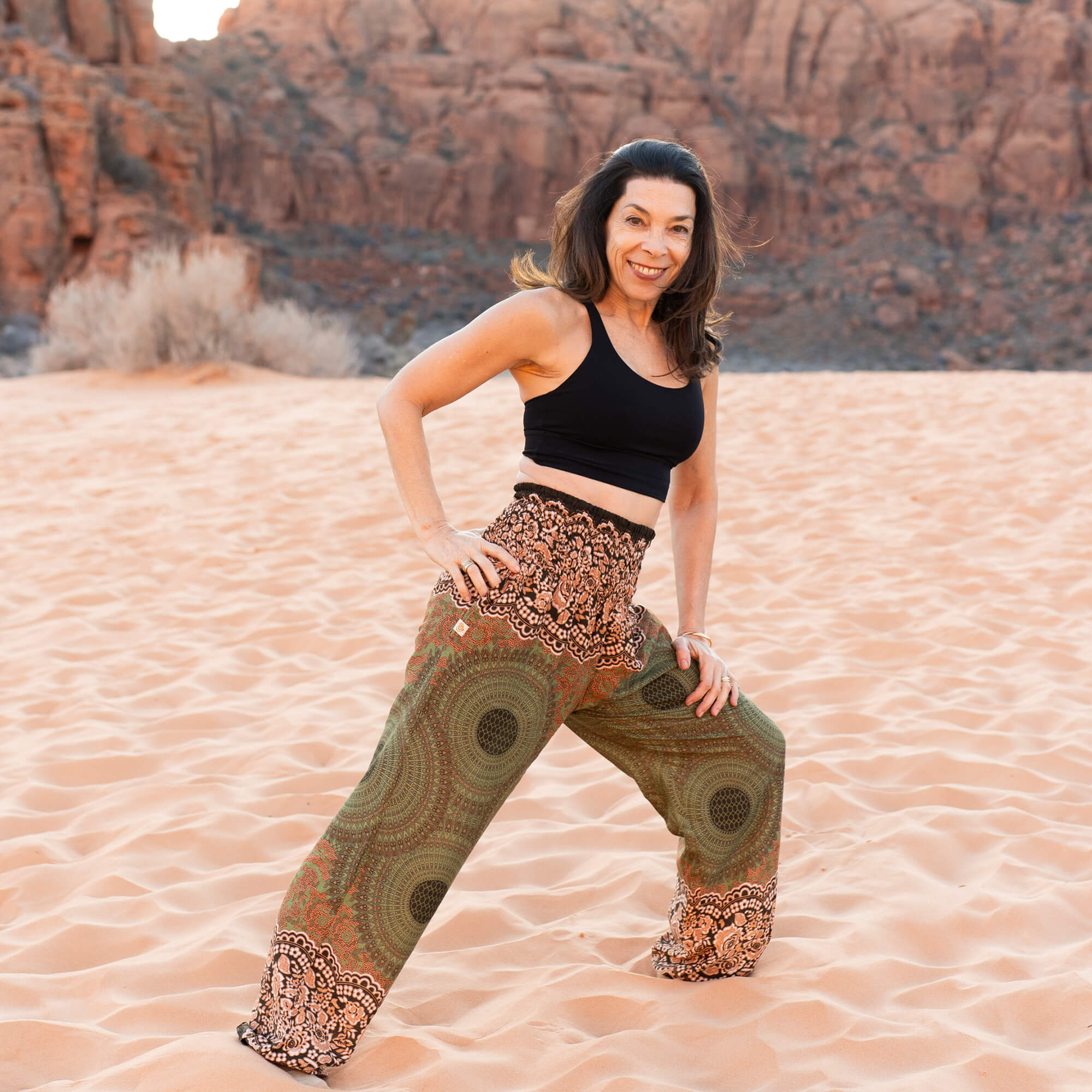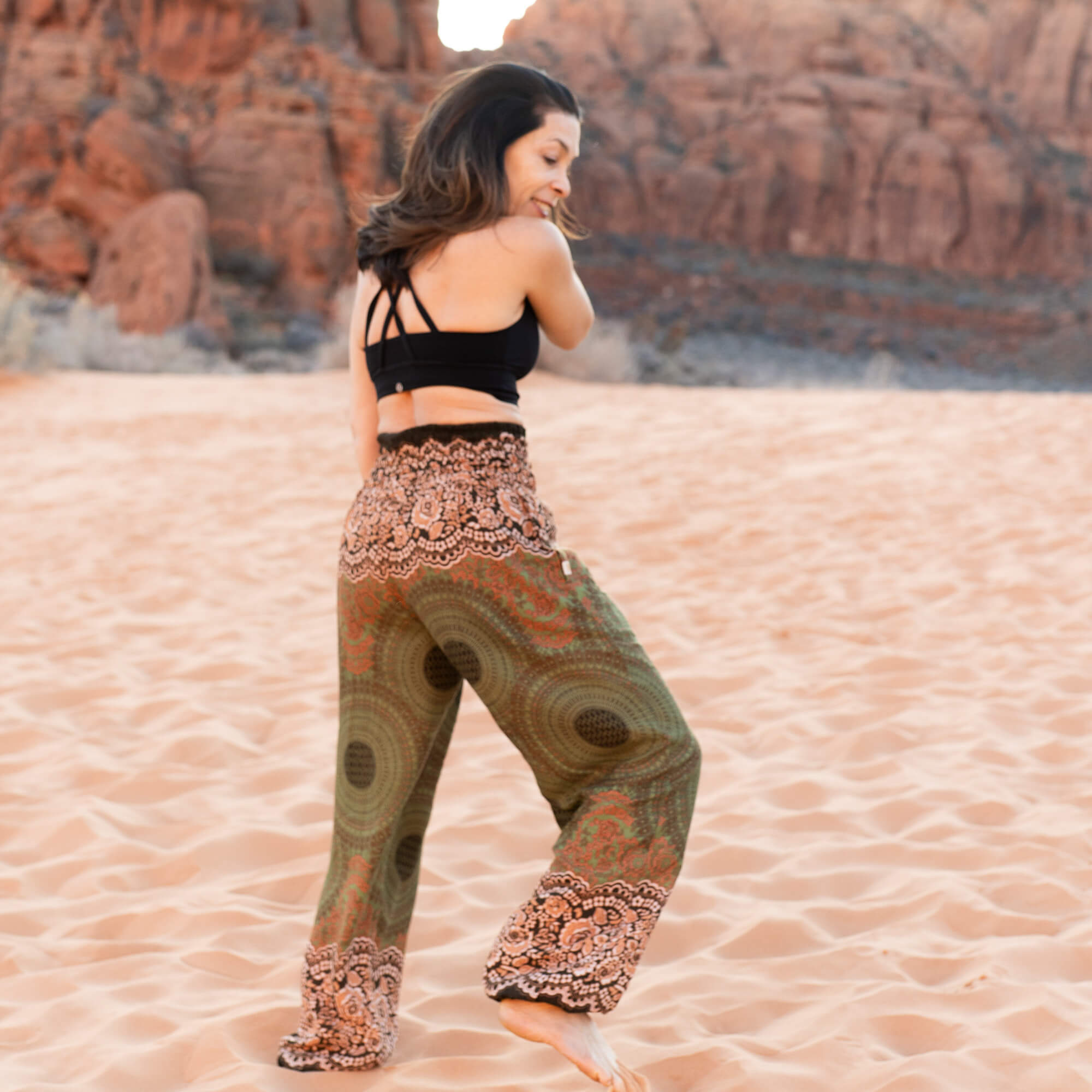 The Free Spirit Mandala Earth Harem Pants bring together the grounding tones of Forest Moss, the warm glow of Amber, and the rich golden hue of Sierra Sun in a mandala pattern that feels both earthy and expressive. This design is part of the Earth Collection—a celebration of stability, connection, and the quiet strength found in nature’s rhythms.