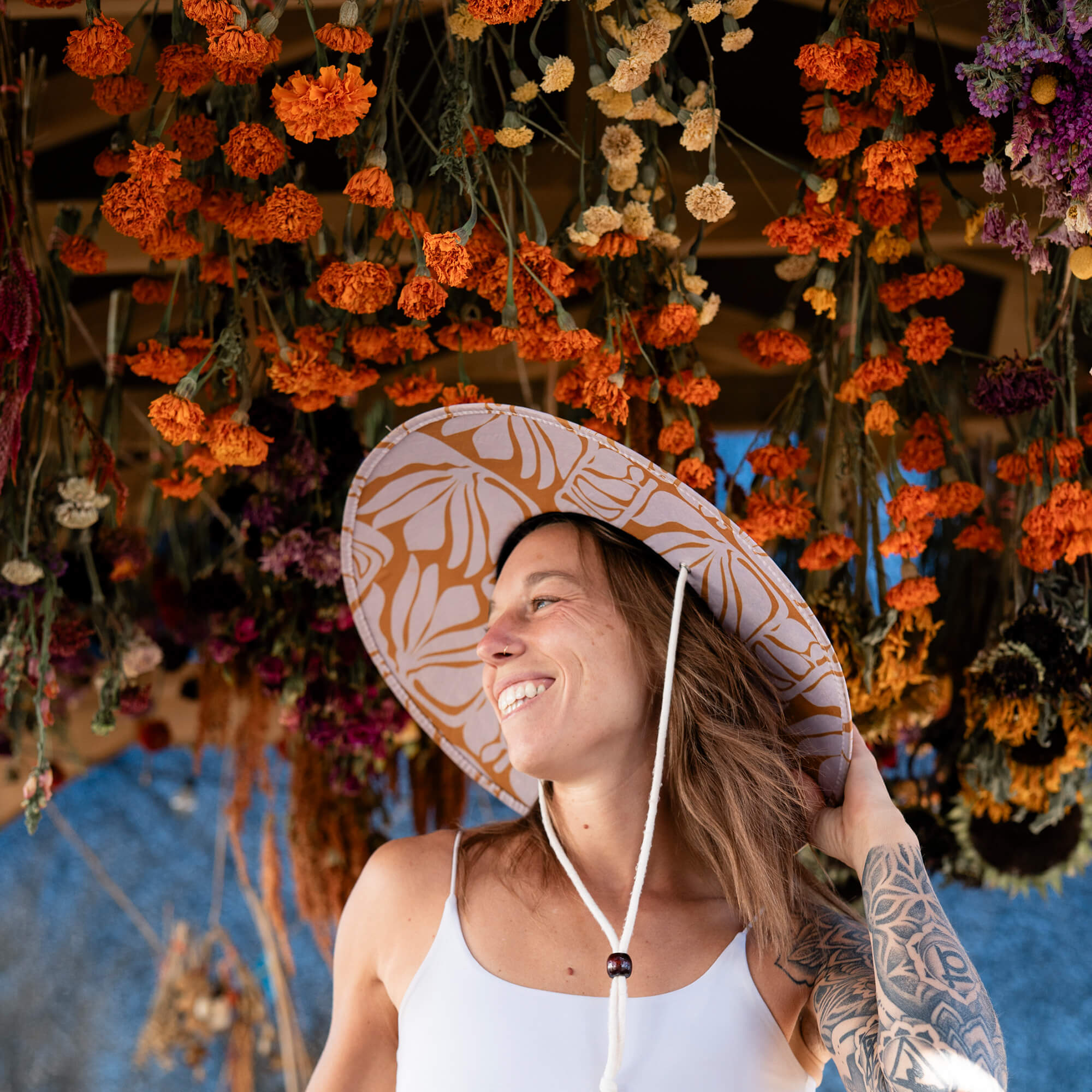 The Charlee hat is our signature crown- The white + mustard under-brim print calls on Fire energy: confident, striking, impossible to ignore.
