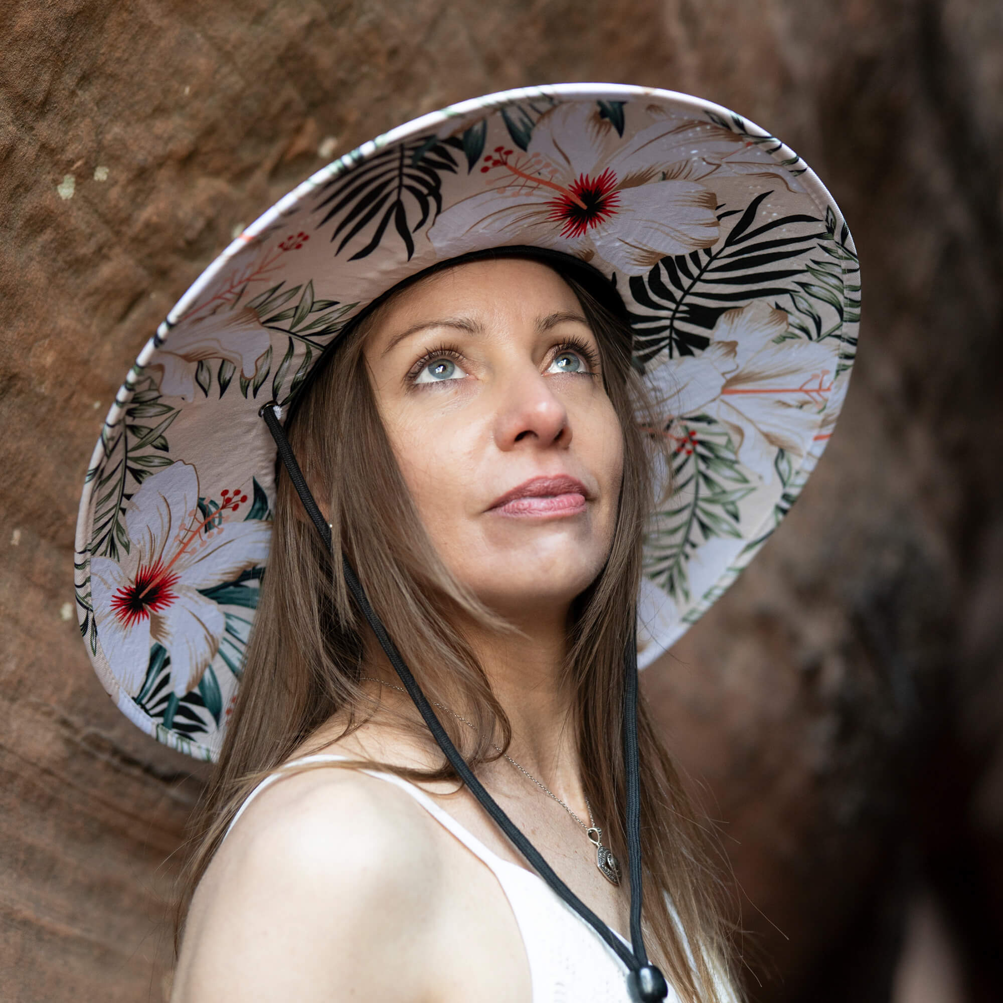 The Layla Hat carries the grounded elegance of the Earth collection — a tropical, refined blend of creamy lilies, deep mossy green palms, and soft botanical tones washed across a warm crème backdrop. Mature. Centered. Timelessly beautiful.