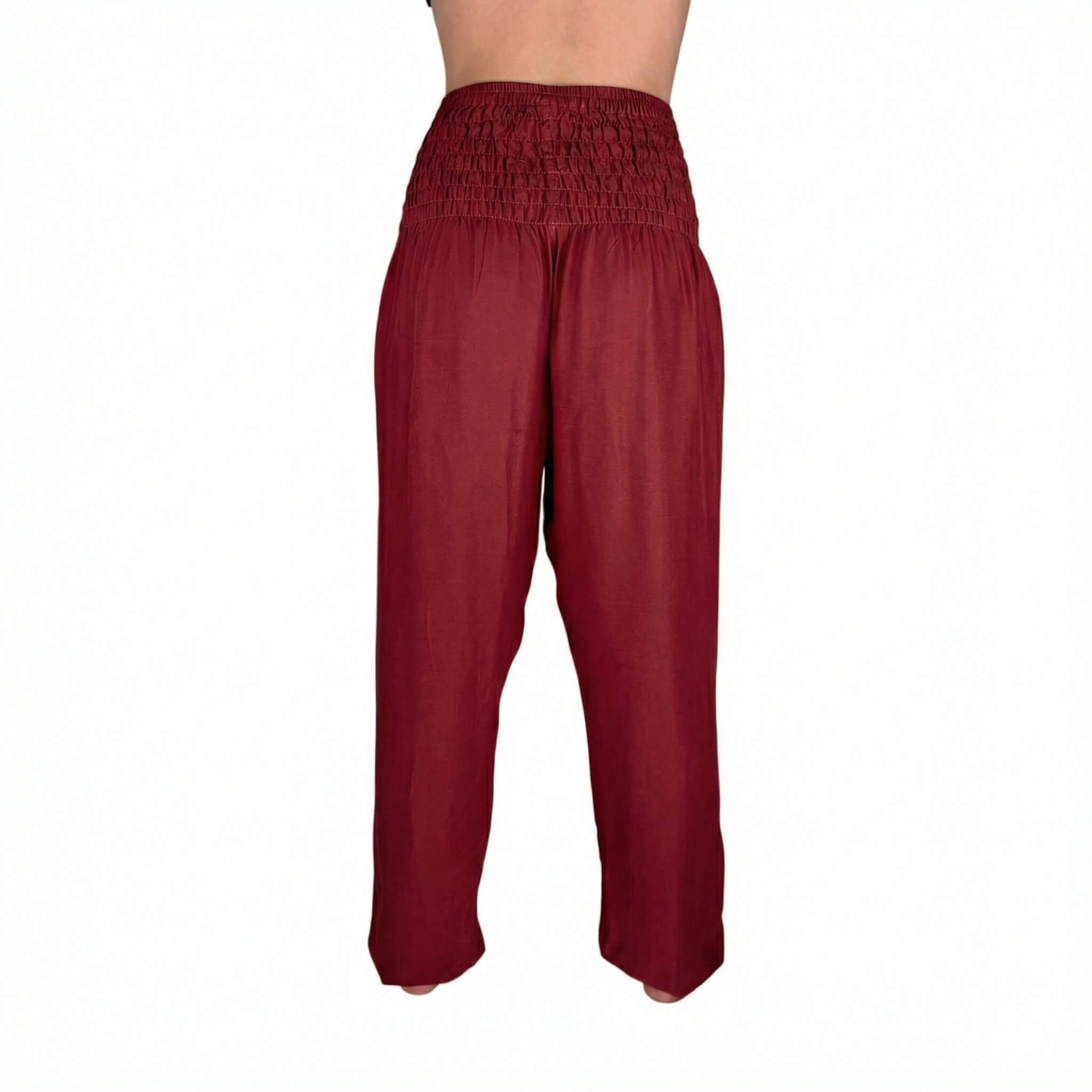 Lightweight boho harem pants in a deep, rich burgundy red. Made from rayon viscose, a plant-based fiber derived from natural wood pulp. Soft, breathable, and lightweight with a smooth feel and a fluid drape that moves with your body. Part of our Earth Collection.